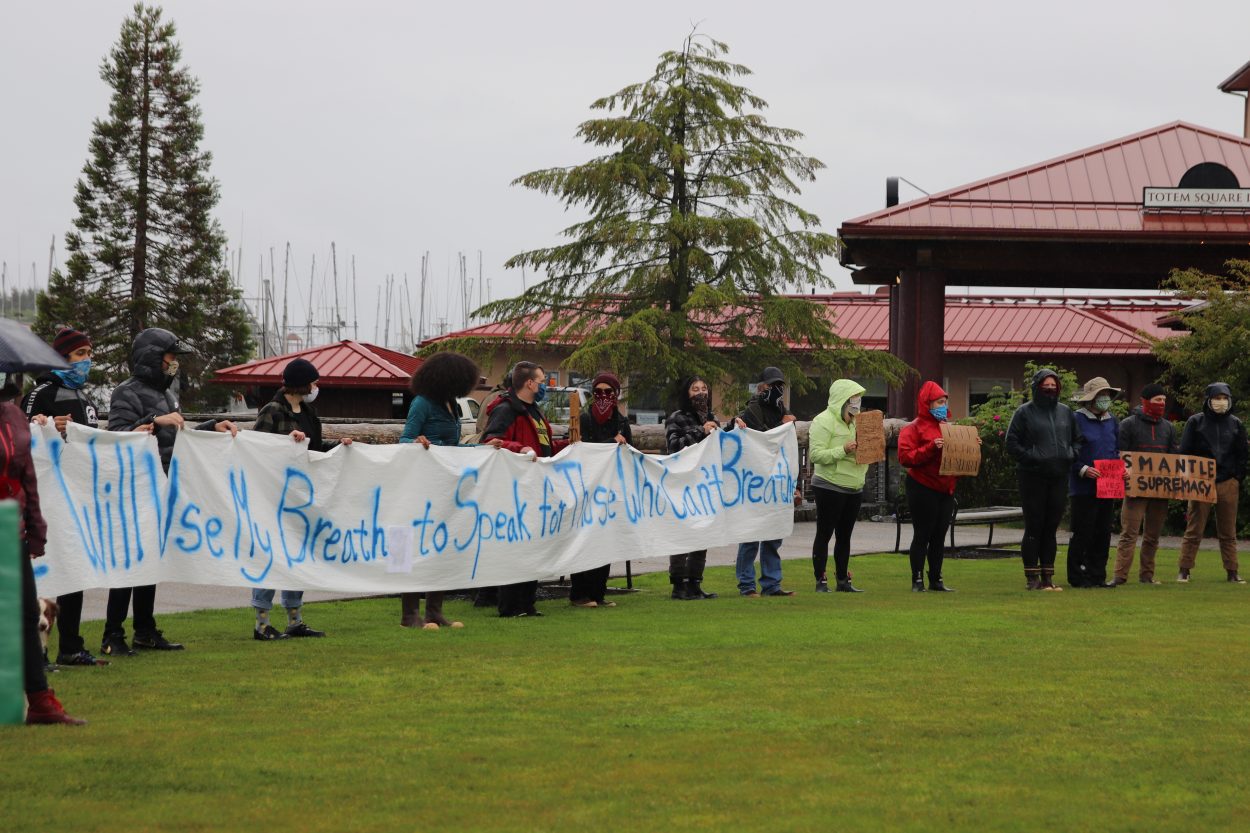 Sitkans held signs in solidarity with Black Lives Matter- “Will Use My Breath to Speak for Those Who Can’t Breath” read one large sign (KCAW Photo)