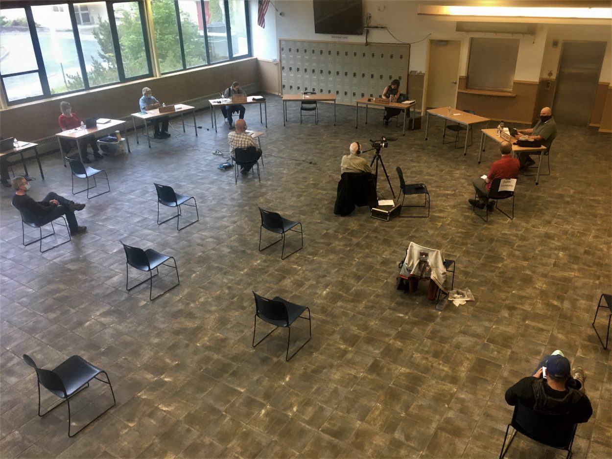 Andrew Hames (in red, far right) answers interview questions posed by the Sitka School Board on Wednesday evening (6-24-20) in the high school commons. Interim superintendent John Holst said the physical distancing in the room was an effort to role model what school might look like when it opens in the fall. (KCAW photo/Robert Woolsey)