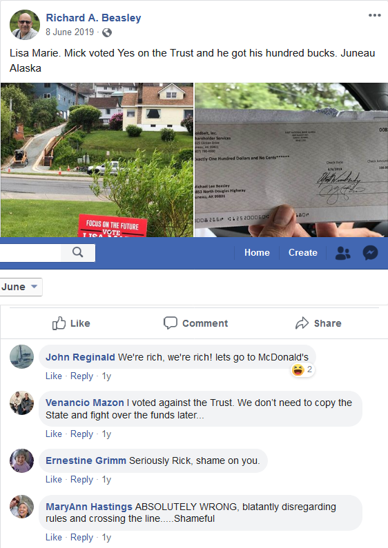 In the weeks leading up to the vote, Board Member Richard Beasley posted a picture of a check for $100 made out to his brother on Facebook. The post said his brother had voted in favor of the resolution and quote: “he got his hundred bucks.”