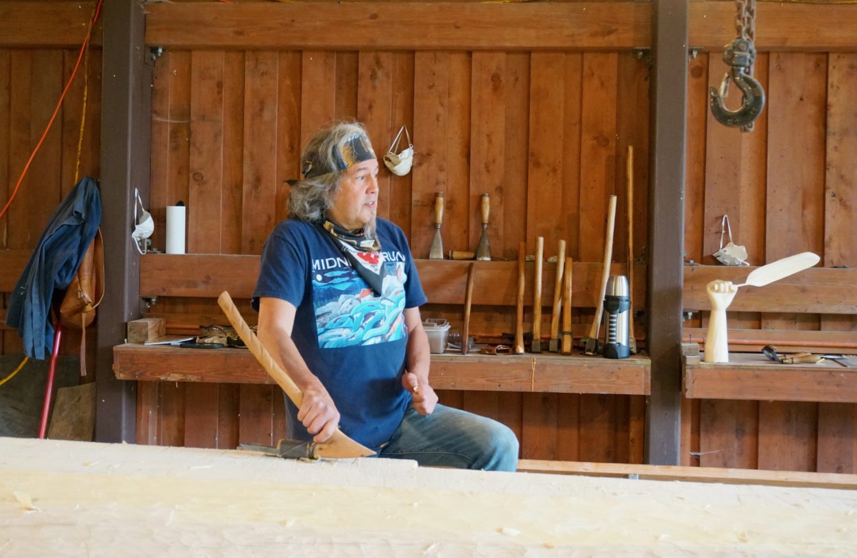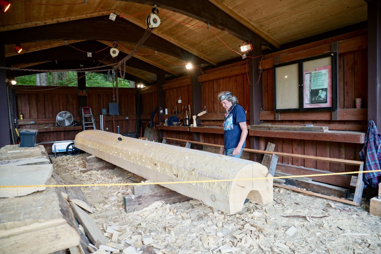 Joseph uses a curved tool called an Elbow Adze to smooth and peel away bits of wood from a yellow cedar log. He’s still in the early stages of transforming the log into a 23-foot totem pole.
