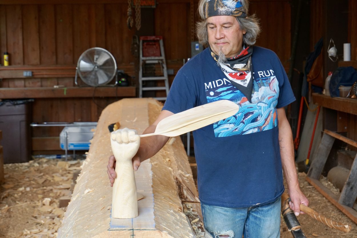 Tommy Joseph holds out a realistic wooden fist attached to a six-foot pole and gives a socially-distanced fist bump. Then, he gets to work inside a roped-off shed, tucked behind the visitor’s center at the Sitka National Historical Park.