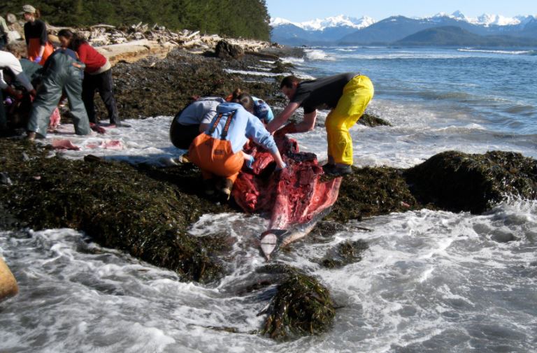 The killer whale in Kake was found near the harbor, already significantly decomposed. Keogh says that community members collected some of the juvenile male’s teeth for traditional artistic purposes, and some of the teeth were forwarded to NOAA for aging. Killer whales put down a new layer of dentin every year on their teeth, which allows researchers to determine how old they are. Also, dietary isotopes can be extracted from the teeth to establish the killer whale’s ecotype: Whether it is a mostly fish-eating resident, or a marine-mammal eating transient.