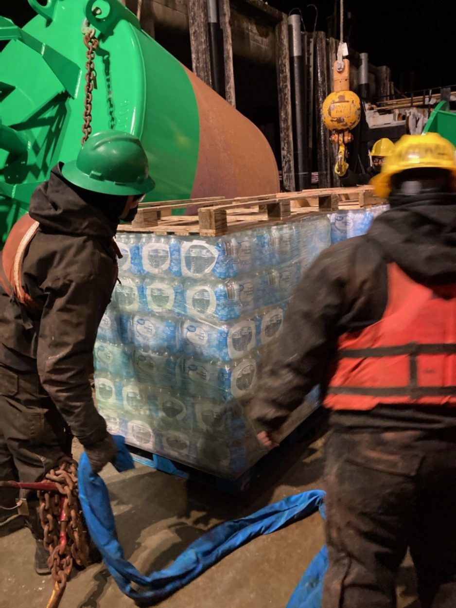 When the ship pulled into the ferry terminal on Saturday evening, Bowen and members of Angoon’s Tribal government, the Angoon Community Association, helped distribute the nearly 7,000 bottles of water.