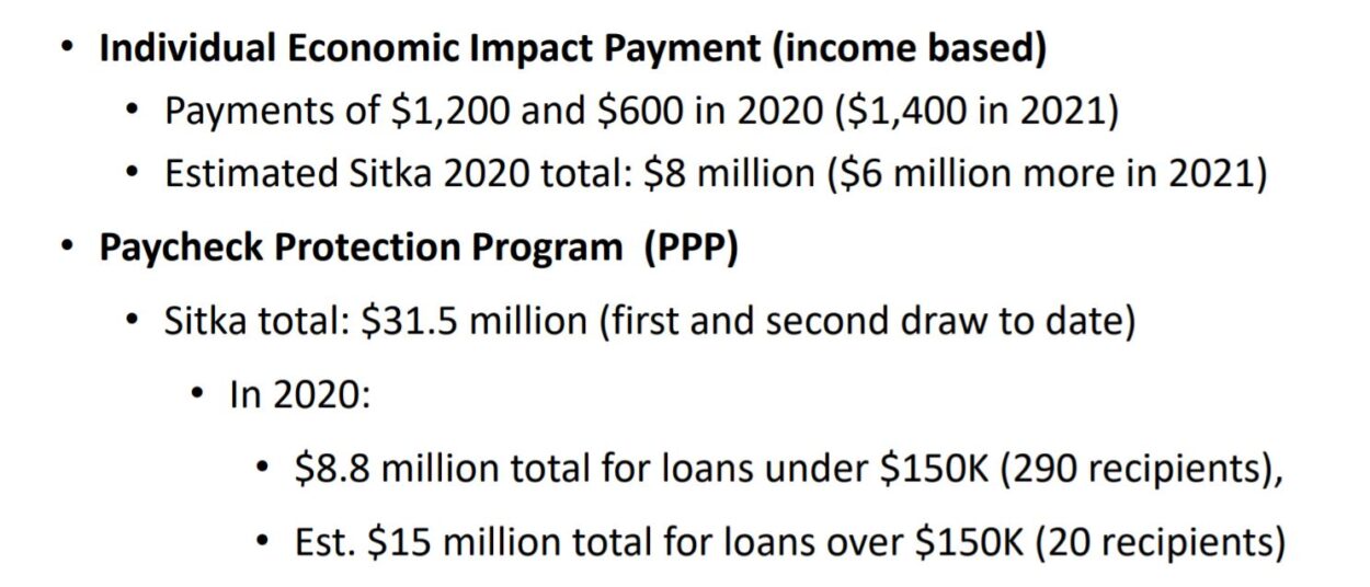 However, federal relief looks like it may have offset the worst of the damage. Economist Jim Calvin, with McKinley Research, presented his analysis of Sitka’s economy last week (4-22-21).