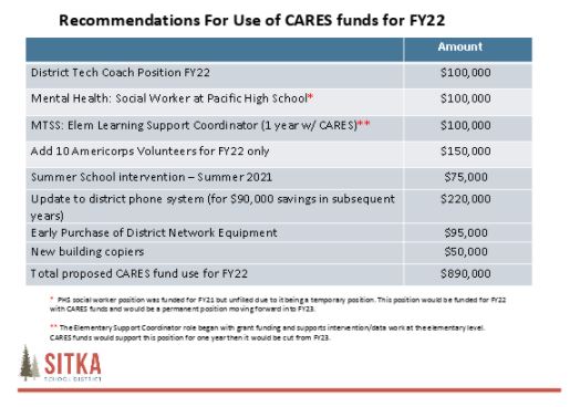 The Sitka School Board approved almost $900,000 in CARES Act relief spending when it met last Wednesday (5-5-21), on everything from additional staff to copy machines.