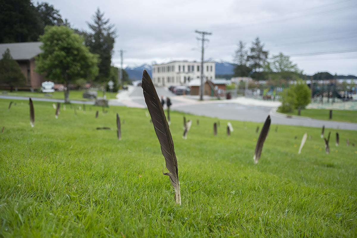 In remembrance, an anonymous artist placed 215 eagle and raven feathers on the lawn of Sheldon Jackson Campus. Sheldon Jackson was a boarding school from the late 1800s well into the 20th century.