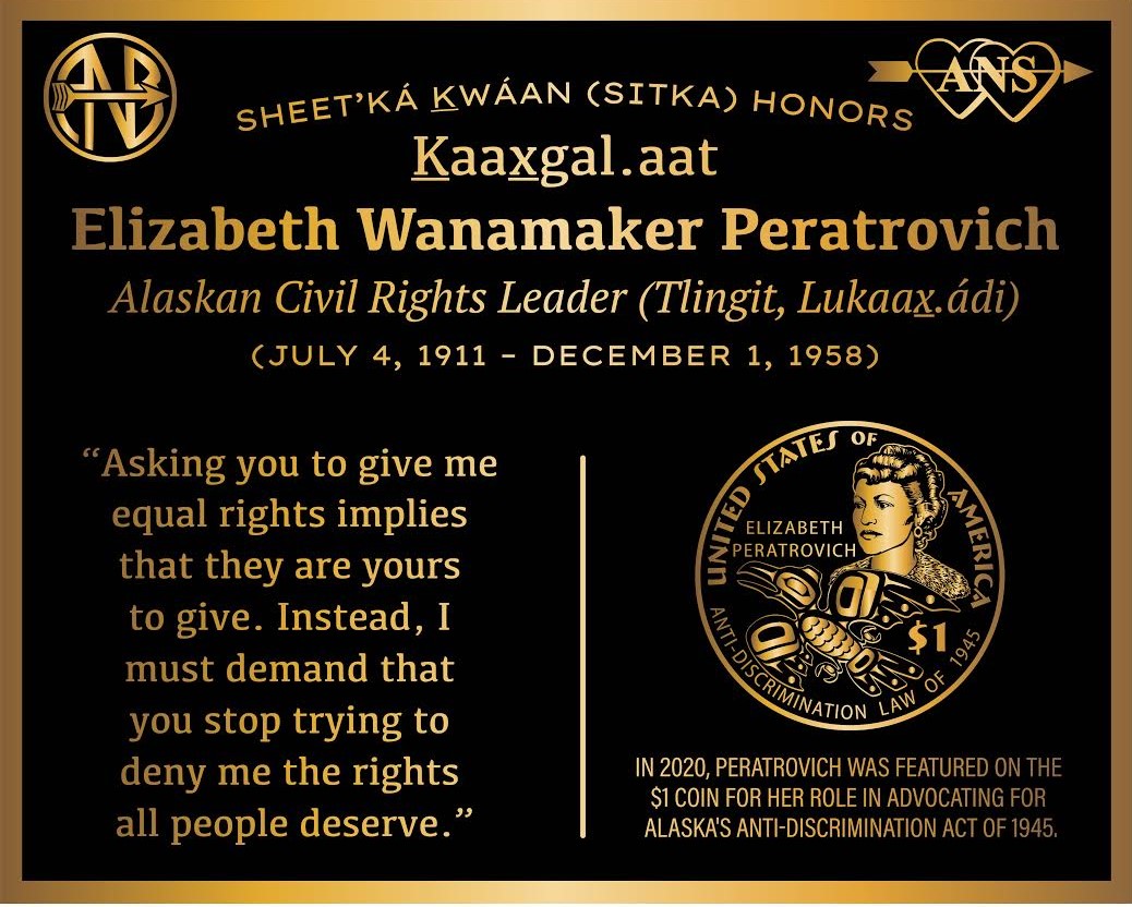 “One of the reasons that we wanted to highlight Elizabeth is because it is time that we accept that her legacy is significant, not only locally but around the world. She is a Tlingit woman who has had tremendous influence not only in the past century, but even moving forward,” said ANS Grand President Paulette Moreno, who is leading the project with Loyd Platson.