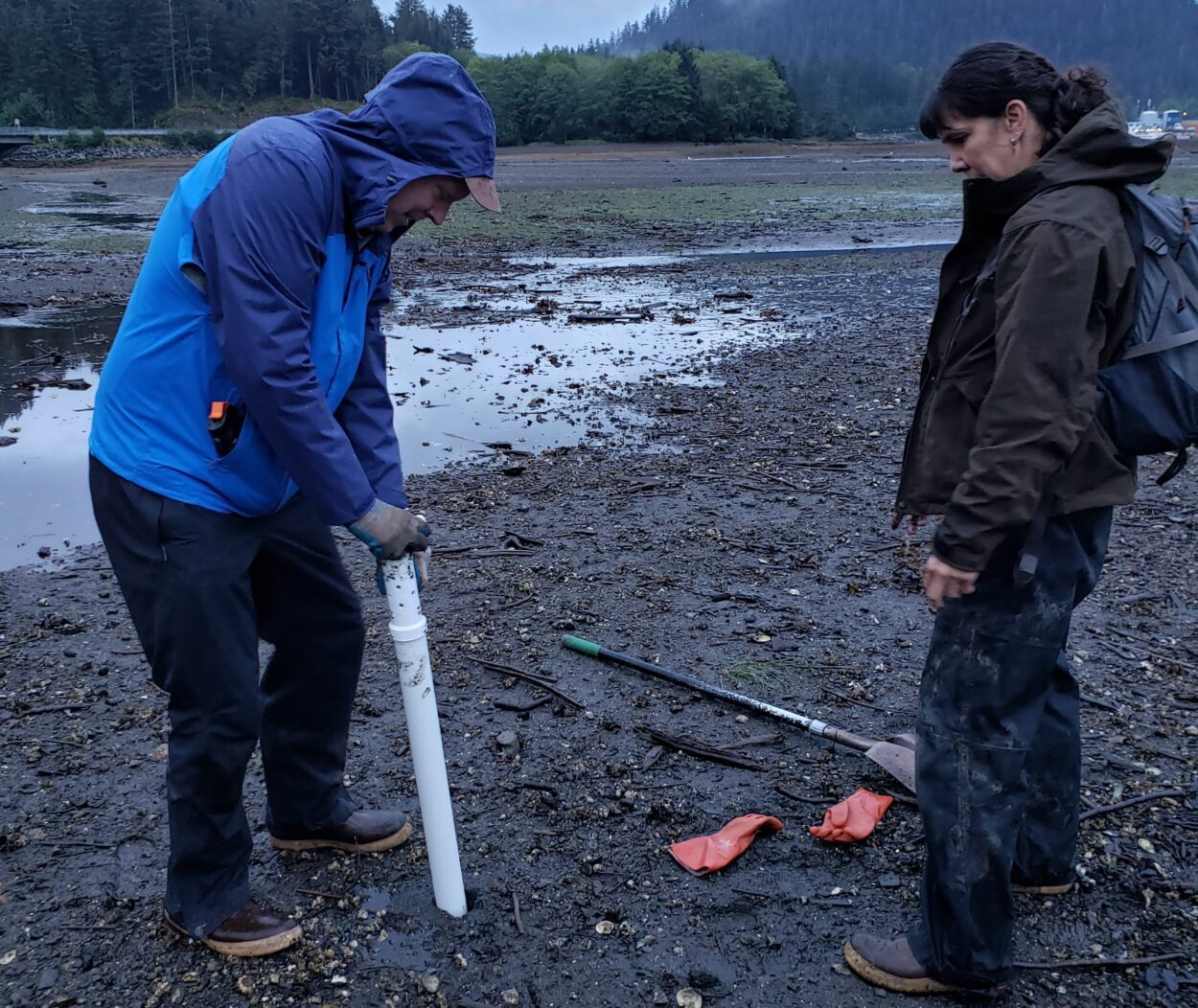 I have lived in Southeast Alaska my whole adult life, and never even heard of blue mud shrimp until I got an email from Karen Johnson, a naturalist in Sitka, and a member of the local Fish & Game Advisory Committee. She’s brought along this pump made from plastic pipe, sort of an oversize version of something you might use to pump the bilge in your skiff.