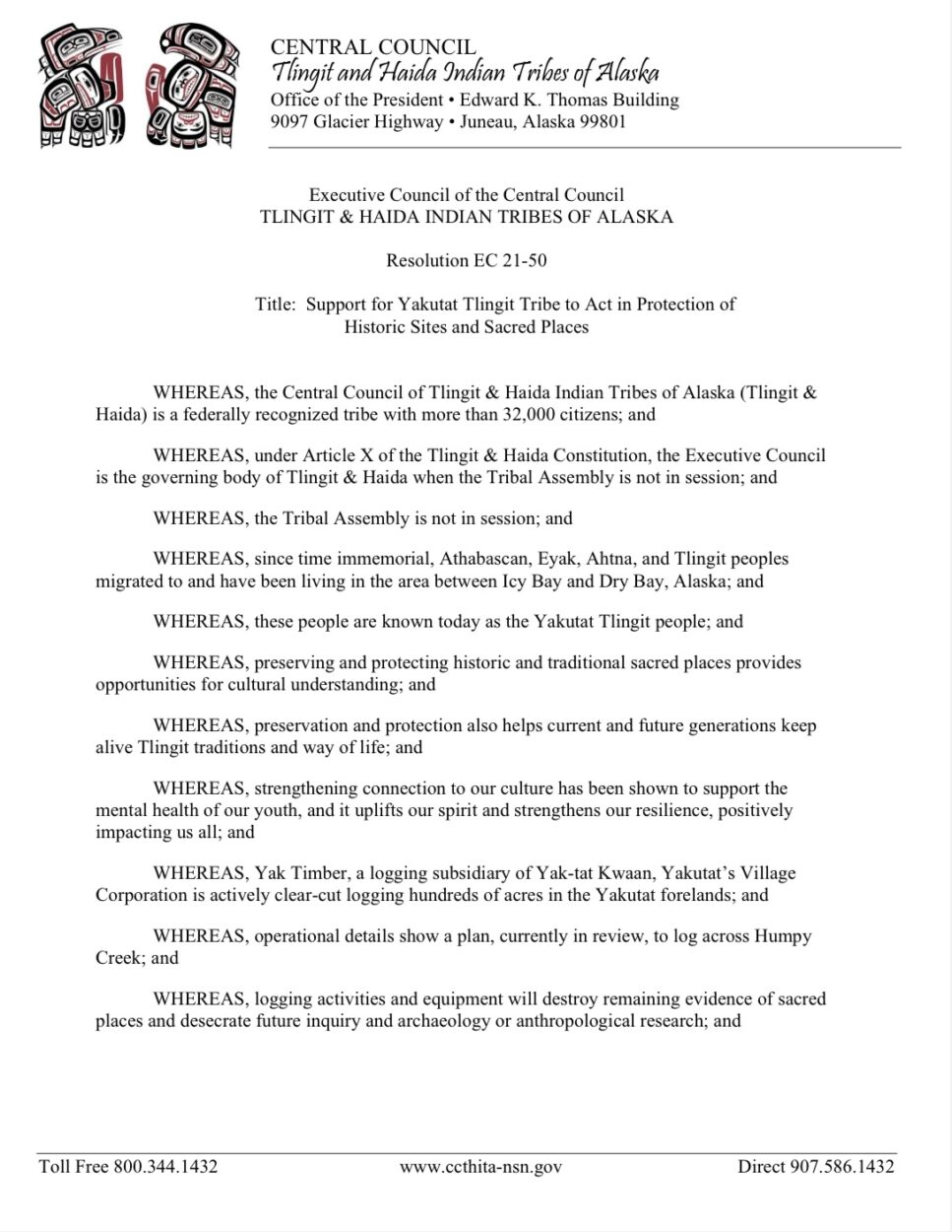 Both Yakutat’s tribal council and the regional Central Central Council of Tlingit & Haida Indian Tribes of Alaska have passed resolutions in opposition to the Humpback Creek timber harvests around Humpback Creek.