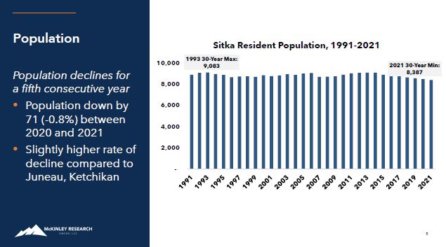 Sitka’s community has lost population for the fifth year in a row. Consultants recently (4-21-22) delivered an annual overview of Sitka’s economic trends in 2021. Katie Berry is an economist with the McKinley Research Group (formerly the McDowell Group), a Alaska research and consulting firm. She said Sitka also saw a “natural decrease” in its population last year– with deaths outnumbering births, slightly.