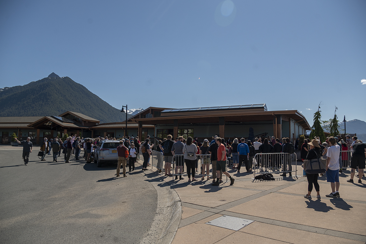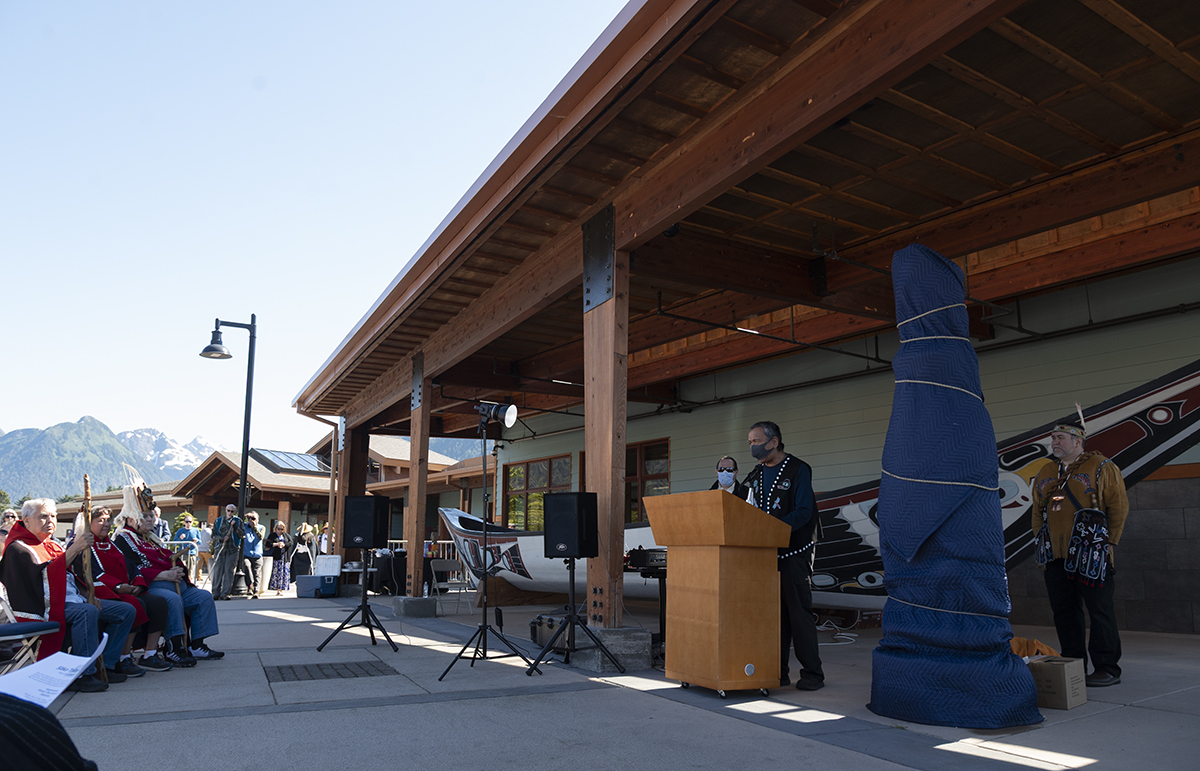 It’s a sunny summer day in downtown Sitka, and a crowd is assembling outside Harrigan Centennial Hall. Behind the podium, shrouded in blankets, is what they’ve all come to see: The unveiling of Tlingit artist Preston Singletary’s Little Bear Mother Story Pole (Xóotsk’i Tláa Kootéeyaa) story totem. The festivities begin with an entrance dance, and opening remarks by Tlingit cultural teacher Chuck Miller.