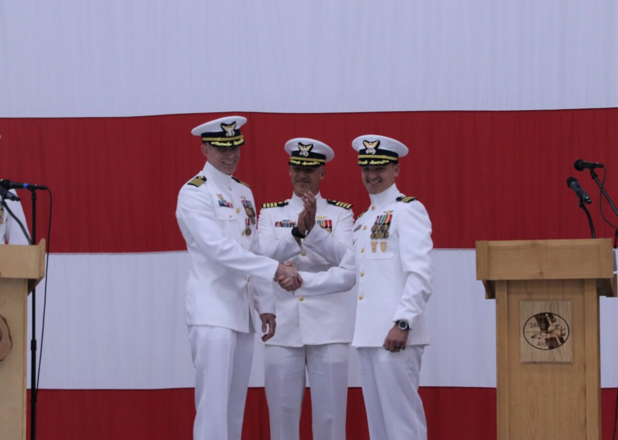 McLaughlin has served as Air Station Sitka’s commander since July of 2020. Before stepping down, he said his goodbyes in a thoughtful speech, peppered with jokes, and even a couple of spelling lessons. McLaughlin will be transferring to the Coast Guard 17th District in Juneau as the new chief of incident management.