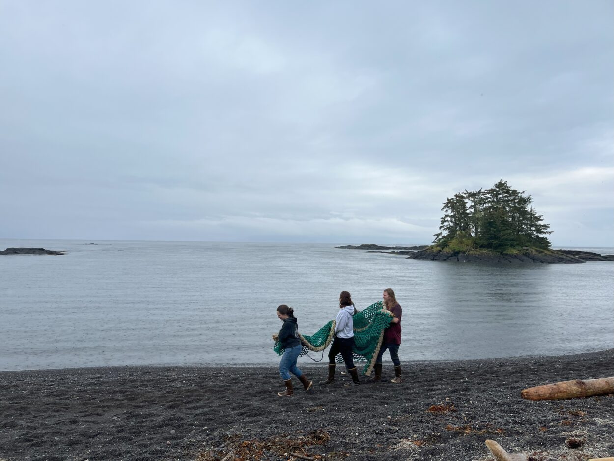 Linda Behnken, who runs the Alaska Longline Fisherman’s Association in Sitka, helps to heave part of a brightly-colored fishing net out from under a driftwood log. It’s so heavy that a dozen people are enlisted to carry the pieces back to the boat.