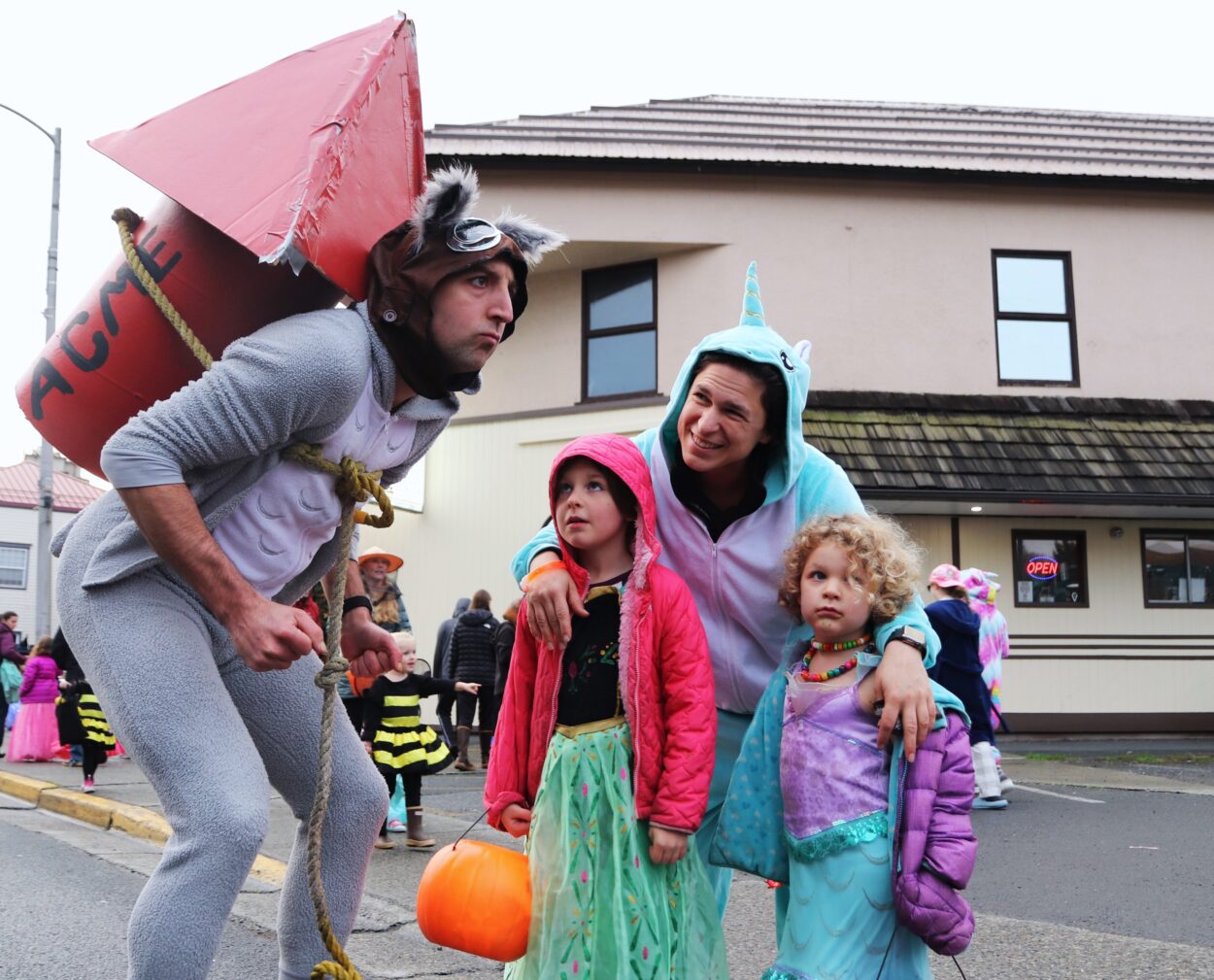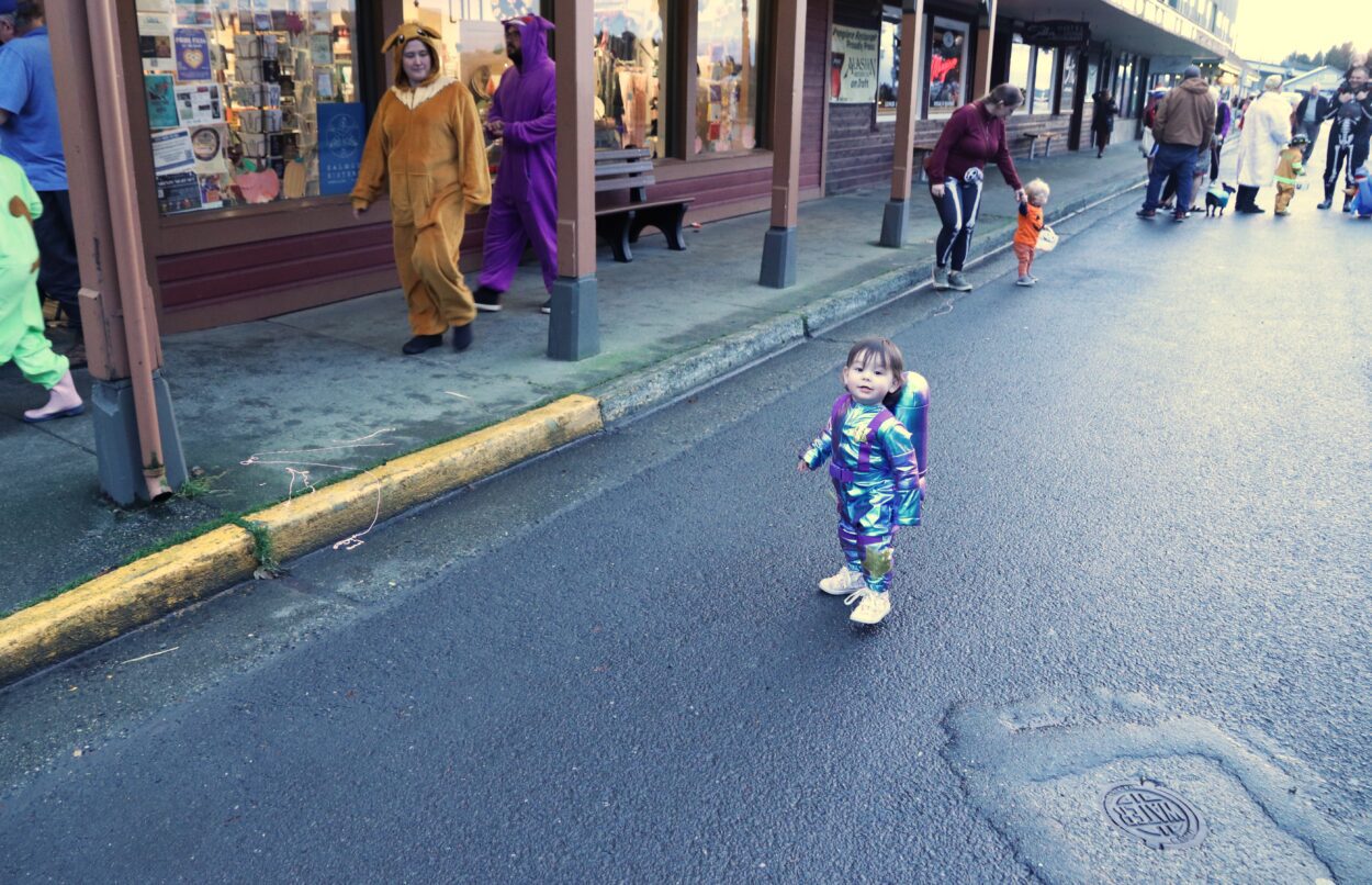 With temperatures in the mid-40s and only a hint of drizzle, Sitkans turned out in droves to trick-or-treat on Lincoln Street yesterday. Downtown businesses offered candy to cowboys, bumblebees, and ghosts, plus dog treats for costumed canine companions.