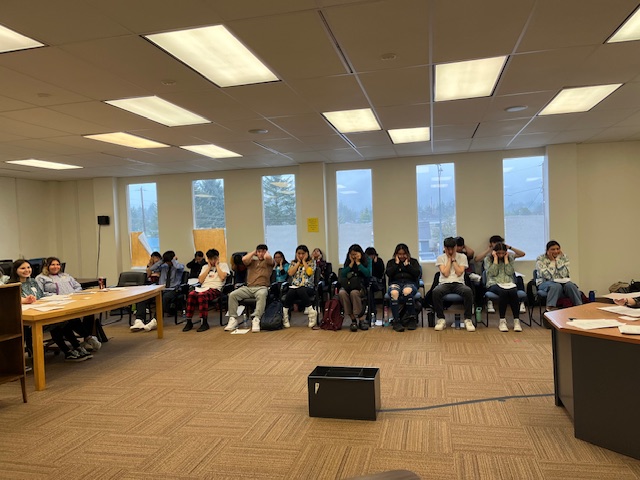 Eighty-six students from Mt. Edgecumbe High School are here for Color of Justice, an educational program that encourages students from underrepresented populations to consider legal careers. They’ve only had about an hour to prepare questions, read affidavits, and learn their roles. Students around the courthouse are sitting on the floor and in folding chairs hunched over their papers, drafting questions for cross-examination with gel pens and trying to memorize their own witness testimony. Legal professionals are scattered among the students, answering questions.