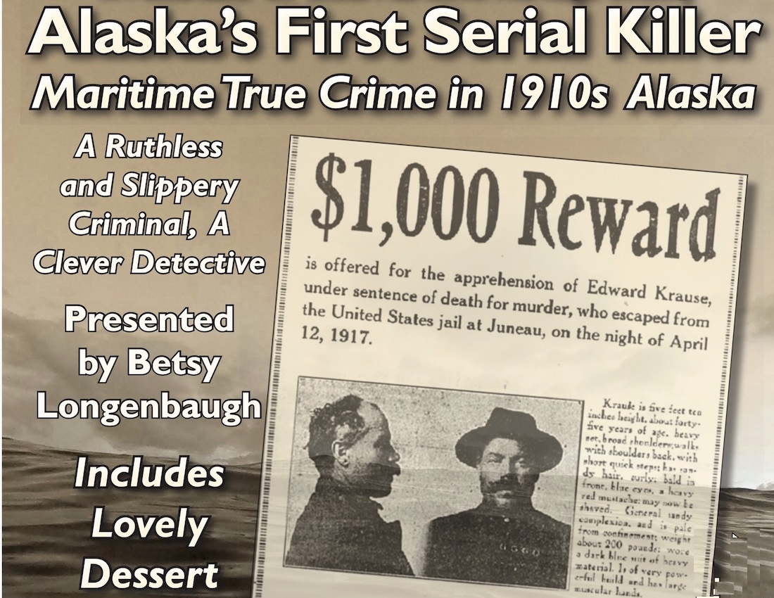 Author Betsy Longenbaugh will give a presentation on Alaska’s first serial murderer, 7 p.m. this Saturday (1-20-24) at Harrigan Centennial Hall. It’s a fundraiser for the Sitka Maritime Heritage Society, and dessert is included. Tickets $35 online at sitkamaritime.org, Old Harbor Books, or at the door.