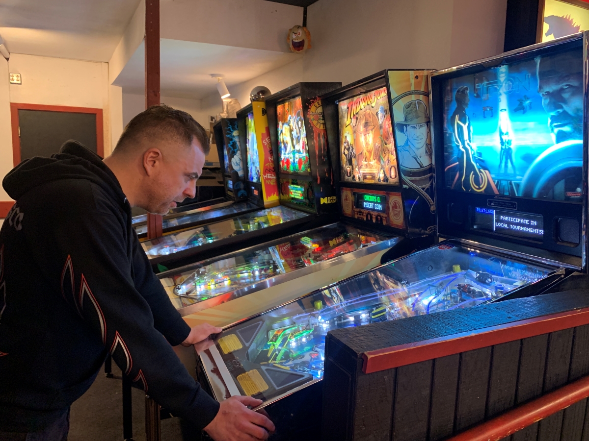 He’s playing the rare Tron Legacy pinball game. As he flicks the flippers, the music of Daft Punk blasts from the speakers. Once or twice the silver ball gets stuck somewhere and he quickly nudges the machine. “Tilting is trying,” he says.