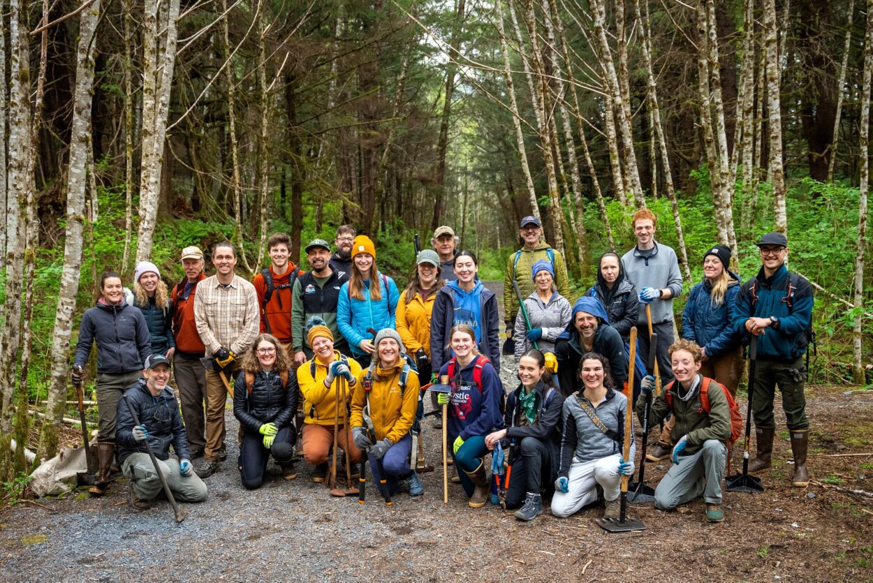 Hughey: “I think for this particular award, the local Ranger District nominated us because of the unique partnership and program we’ve been developing over the past few years to engage Alaskans in volunteer stewardship of trails. In particular, there are some unique challenges for small communities in Southeast Alaska when it comes to trail maintenance and development. First, there’s the environment. It’s rainy, it’s muddy. You have to constantly cut back brush and clear blow down, and almost every linear foot of trail has to be covered in rock or wood, armoring the tread from erosion. So it’s very resource intensive to maintain trails in Southeast Alaska’s rainforest, and we have less capacity in small towns, whether that’s funding from local governments, retired volunteers who happen to have a lot of experience and tons of time, or large nonprofit organizations that can shoulder tons of work. So given the resource demands and the capacity constraints, we needed creativity to address the desire of our communities to be able to still get outside and enjoy the trails.