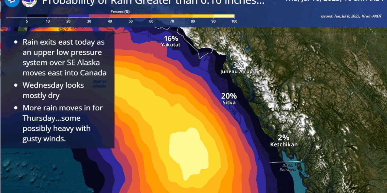 An atmospheric river will saturate the outer coast on Thursday (7-10-25), hitting the southern panhandle of Alaska with heavy rains.