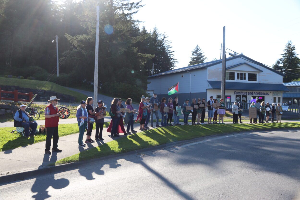 Around 30 Sitkans gathered on Wednesday (8-7-25) to protest Israel’s blockade in Gaza and its continued effects. The group met at the roundabout joining Sitka’s two main state highways around 5:30 p.m. to share their message with the bulk of the community’s post-work traffic.