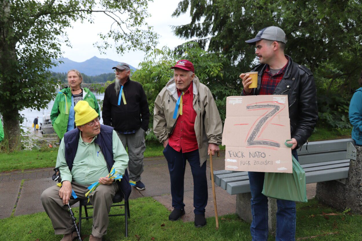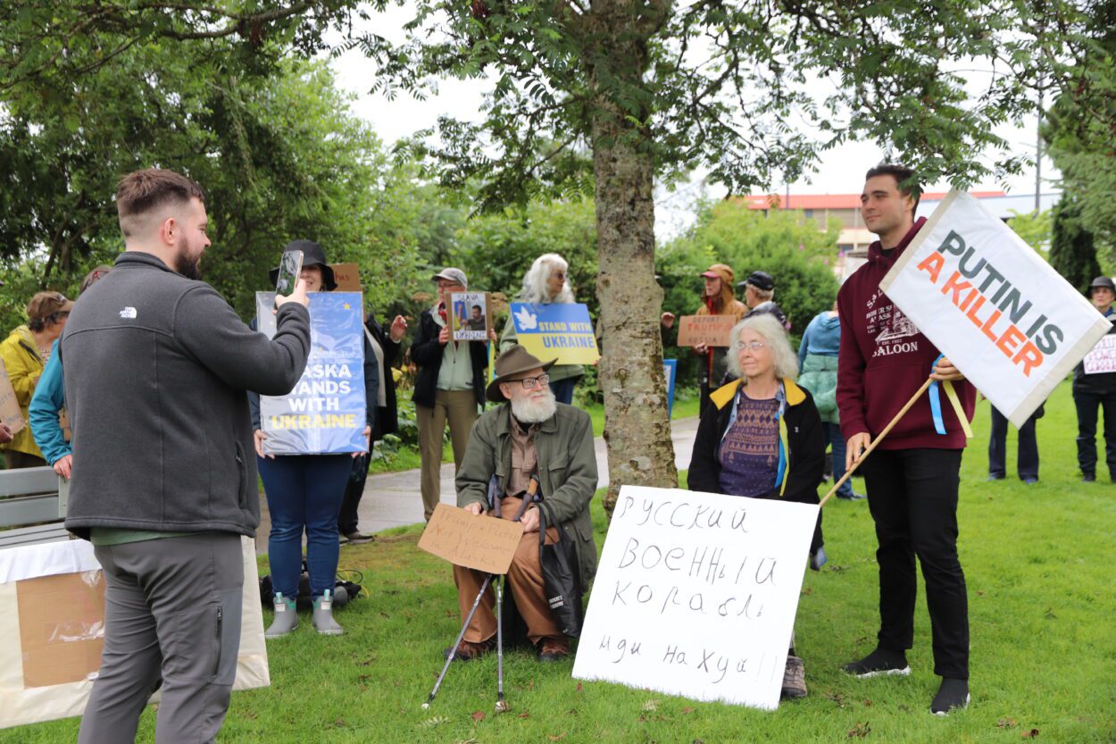 Among the group of demonstrators stood one counterprotestor, holding up a cardboard sign cursing NATO and Ukrainian President Volodymyr Zelensky. The counterprotestor left before KCAW could ask for a comment, shortly after being confronted by Dmitrii Radchenko, who immigrated to Sitka with his family from Moscow two years ago as a direct result of the war in Ukraine.