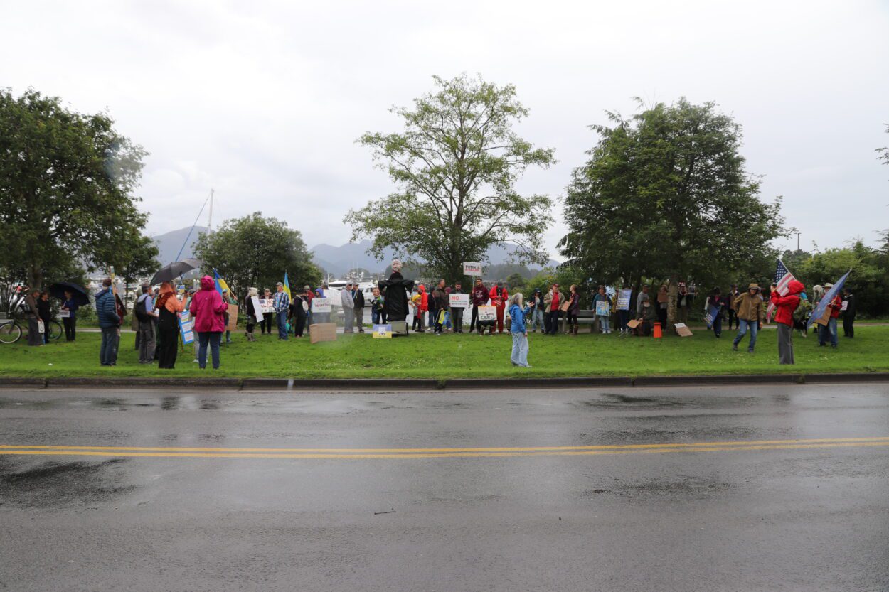 Shortly after the noon bell at St. Michael’s Cathedral struck, nearly 70 people gathered in the greenbelt across from the historic Russian Bishop’s House in Sitka. They carried cardboard signs calling Russian President Vladimir Putin a war criminal and condemning President Donald Trump for inviting Putin onto Alaskan soil. Some waved Ukrainian flags, and one protester balanced, on a wheelbarrow, a seven-foot-tall paper-mache sculpture of Putin wielding Trump and Elon Musk as marionette puppets.