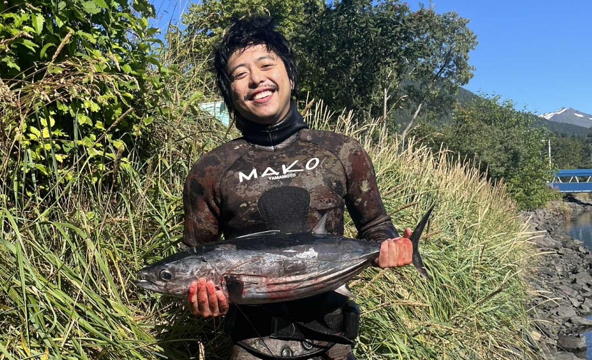 Own was busy studying to get into med school one day in late August, when he heard a couple of tuna were spotted in a harbor in downtown Sitka. The highly unusual sighting was enough to pry him away from his books. At the harbor, he watched as folks tried to catch the fish, but they weren’t biting, and fishermen on the dock were getting frustrated. One hollered, “Someone should just go in the water and spear that thing.” Own said he had his spear in the car.