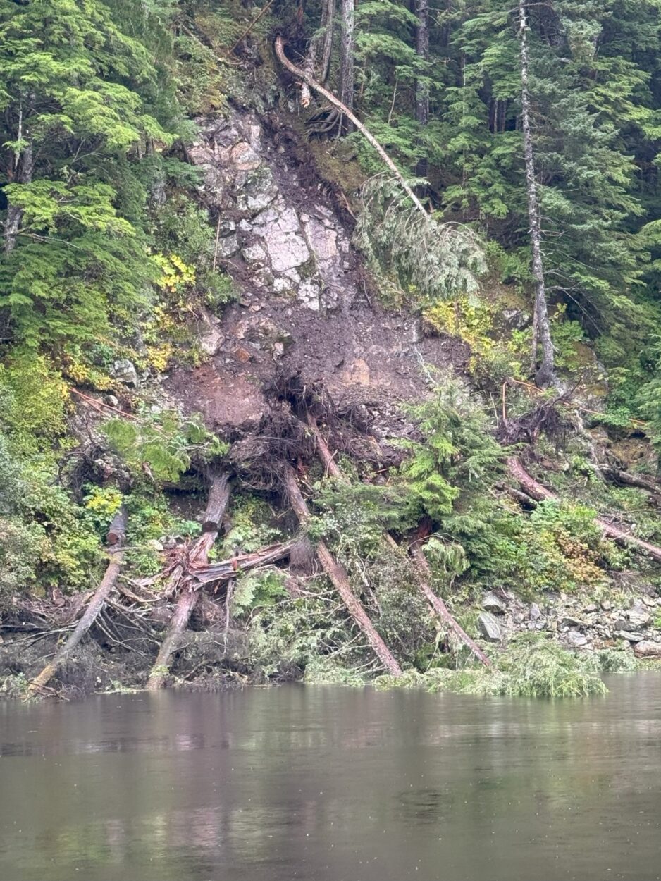 Tyler Magart lives in Elfin Cove seasonally and owns a business there. She said a response team from the Alaska Department of Transportation arrived Tuesday (9-23-25) morning with a drone to assess the slide activity that can’t be seen from the ground. At sea level, residents are still trying to quantify the damage.