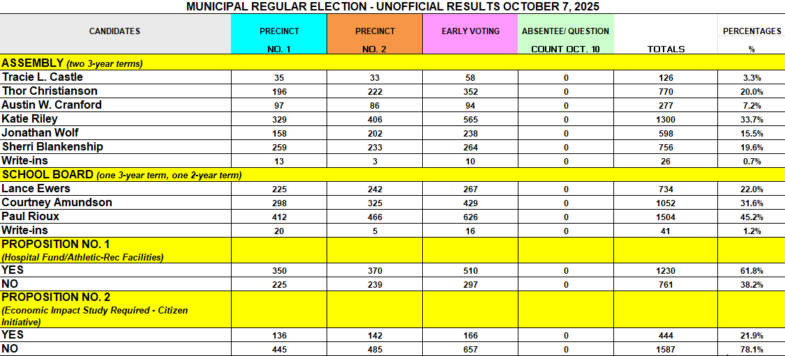 The results are unofficial until the Municipal Clerk counts the remaining absentee ballots on Friday, October 10. The results will be certified at the Sitka Assembly meeting next Tuesday (10-14-25).