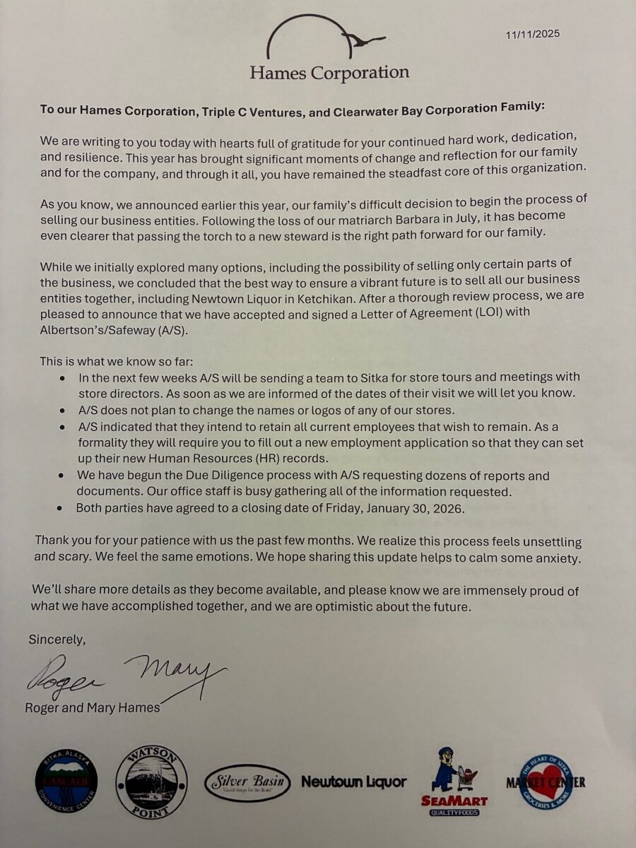 Several months after announcing a plan to sell the company, the Hames Corporation has found a likely buyer. Owners of the Sitka grocery business announced on Tuesday (11-11-25) that they have signed a letter of agreement to sell the business to Albertsons-Safeway, a national grocery chain.