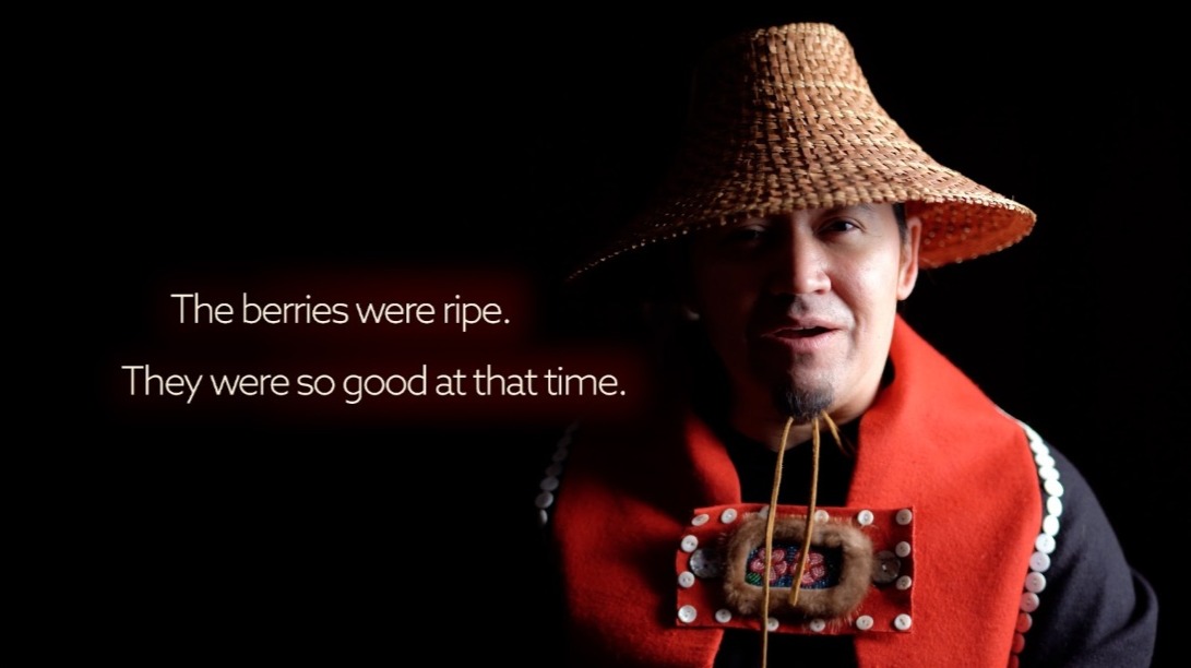 The film opens with a scene of a man donning regalia, intercepted by aerial shots of Sitka. In Lingít, he says, “The berries were ripe. They were so good at that time.”