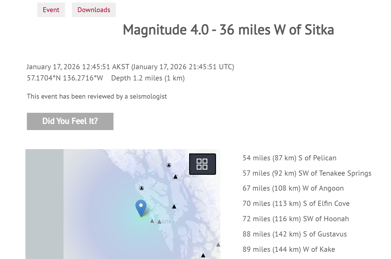 Sitkans felt the earth move on Saturday when an earthquake hit west of the community shortly before 1 p.m. The Alaska Earthquake Center reported that the Magnitude 4 quake hit at 12:45 p.m. 36 miles west of Sitka, at a depth of just over 1 mile.
