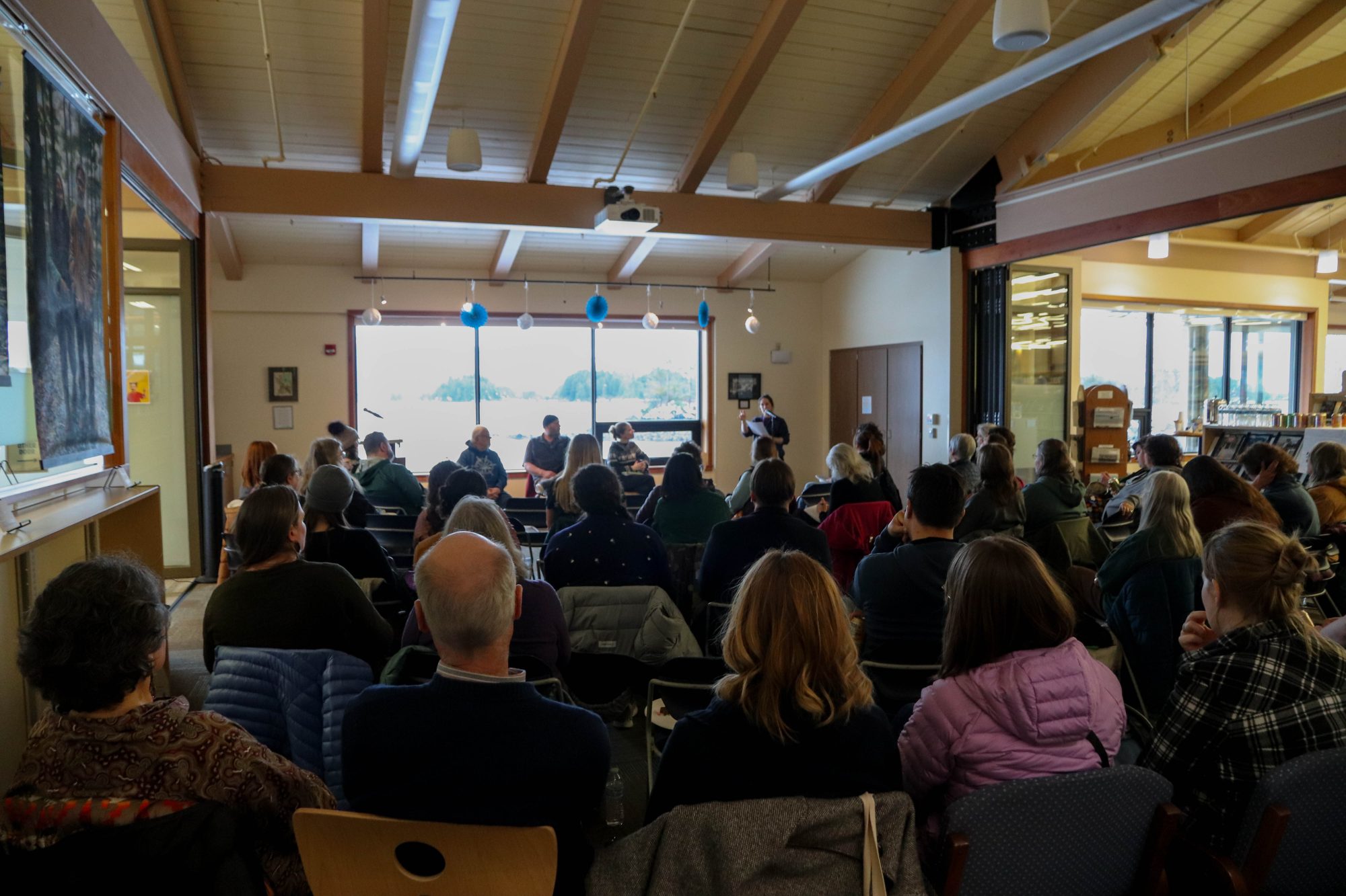 As the event draws to a close, the fisherpoets and librarians mingle, with some snacking on the fish treats caught and prepared by the fishermen themselves. With shelves chock-full of books on one end, and a large glass window framing Sitka Sound on the other, the patrons are surrounded by stories.