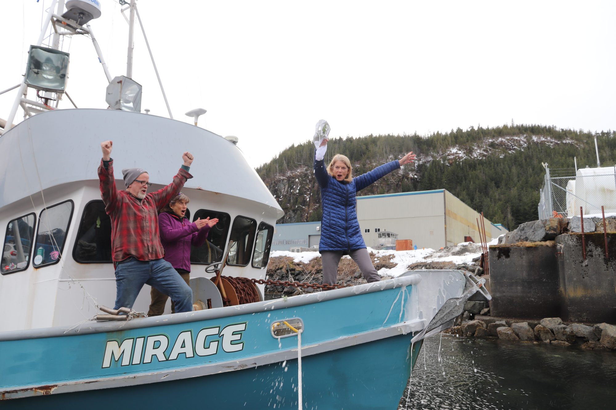 Murkowski is joined by over 20 attendees gathering around the Mirage at the Gary Paxton Industrial Park dock. Murkowski, Turner and Behnken take a spot at the bow of the ship, with Murkowski christening it by successfully smashing a champagne bottle over the bow. That’s followed by a toast in honor of what has been accomplished so far, and what the hybrid engine could mean for fishermen across Alaska and the rest of the country.
