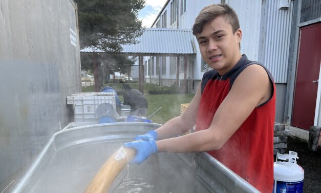 The smell of simmering whale bones wafted through the parking lot of Sitka’s UAS campus on Saturday (10-21-23). Students and volunteers are working on a project to rearticulate the skeleton of a juvenile humpback whale that washed up on Kruzof Island this spring – but first, they have to boil the bones.
