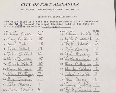 Unofficial election results from Pelican, Tenakee Springs, Angoon and Port Alexander