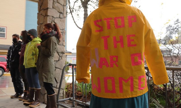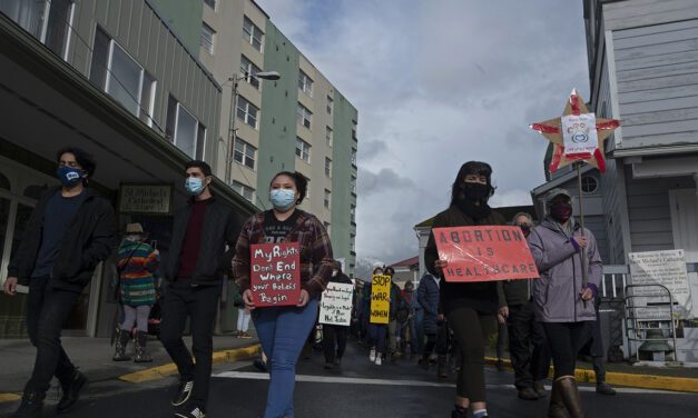 Sitkans gathered in front of the local courthouse on Tuesday (5-3-22) to demonstrate in support of reproductive rights, after a leaked draft Supreme Court opinion suggested that a majority of the court will support overturning Roe versus Wade, the 1973 case that legalized abortion nationwide.