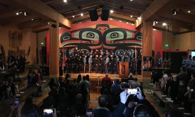 37 law enforcement officers graduated from the Public Safety Training Academy in Sitka today in a ceremony at Sheet’ka Kwaan Naa Kahidi. They spent 16 weeks training and will serve in communities throughout Alaska. KCAW’s Enrique Pérez de la Rosa attended the ceremony and provides this postcard.