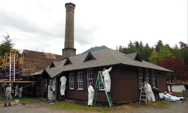 Justin Han, Murielle LeMaire, Kate Latimore, and Quinn Evangelakos are four of eight students in the Historic Restoration Internship Program on the Sheldon Jackson Fine Arts Campus. The month-long program is "hard work, but a chill atmosphere" for the interns, some of whom have never hammered a nail or operated a power tool.