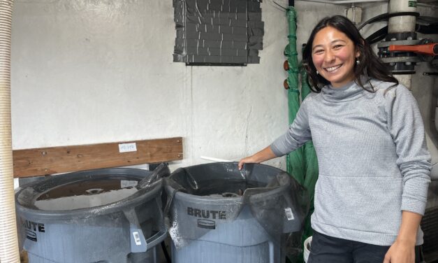 Researcher Haleigh Yang stands next to two trash cans containing sand lance, a forage fish...