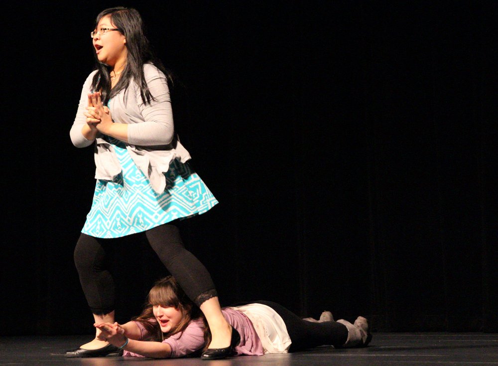 Sitka High juniors Kristine Banh (standing) and Debbie Yearwood perform a piece called Urban Matrimony and the Sandwich Arts, from the television series Community, during the Sitka Drama, Debate, and Forensics Team's Performance Showcase Friday (2-13-15).